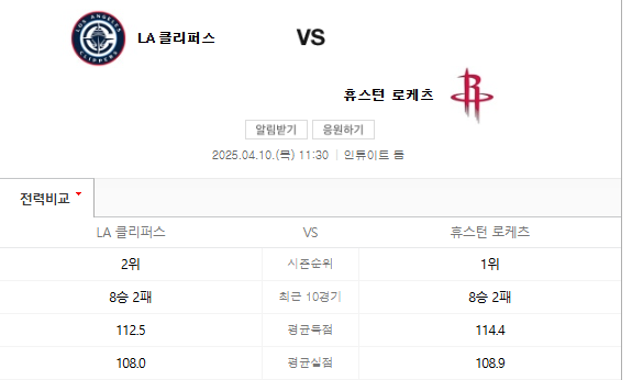 2025년 4월 10일, LA 클리퍼스와 휴스턴 로케츠의 경기가 열립니다. 이 경기는 NBA 정규 시즌의 중요한 일환으로, 두 팀 모두 플레이오프 진출을 위해 필사적으로 싸울 것입니다. 클리퍼스는 최근 상승세를 타고 있으며, 로케츠는 다소 부진한 모습을 보이고 있습니다. 하지만 농구는 예측할 수 없는 스포츠이기 때문에, 어떤 결과가 나올지 기대가 됩니다.