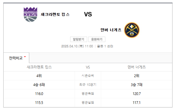 2025년 4월 10일, 새크라멘토 킹스와 덴버 너겟츠의 경기가 예정되어 있습니다. 이번 경기는 NBA 서부 컨퍼런스에서 중요한 대결로, 두 팀 모두 플레이오프 진출을 위해 필사적인 상황입니다. 이번 포스팅에서는 경기의 전반적인 분석과 예측을 해보도록 하겠습니다. 🏀