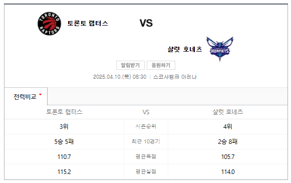 이번 경기는 2025년 4월 10일 오후 7시에 시작될 예정이며, 장소는 토론토의 스카샤 헤드홈입니다. 현재 두 팀 모두 플레이오프 진출을 목표로 하고 있으며, 특히 샬럿 호네츠는 최근 몇 경기에서 부진한 모습을 보였지만, 이 경기에서 반등할 수 있을지 주목됩니다.