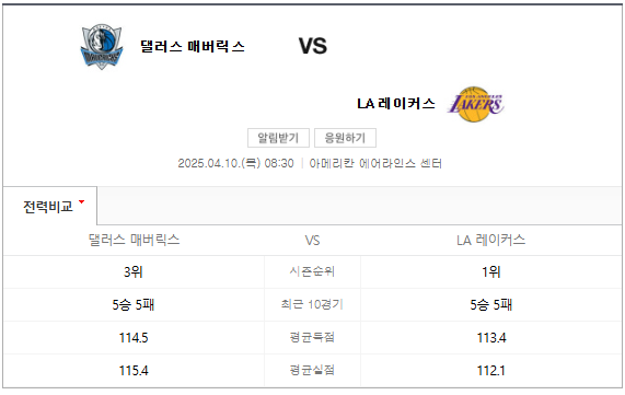 2025년 4월 10일 댈러스 매버릭스 vs LA 레이커스 경기 분석 및 예측
