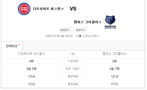 2025년 4월 6일 디트로이트 피스톤스 vs 멤피스 그리즐리스 경기 리뷰