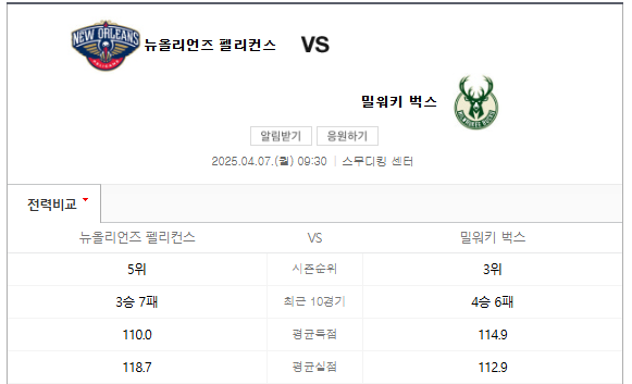 2025년 4월 7일, 뉴올리언즈 펠리컨스와 밀워키 벅스의 경기가 예정되어 있습니다. 이 경기는 NBA 정규 시즌의 중요한 일환으로, 두 팀 모두 플레이오프 진출을 위해 필사적인 상황입니다. 특히, 밀워키 벅스는 최근 몇 경기에서 좋은 성적을 거두고 있어 더욱 기대가 됩니다.