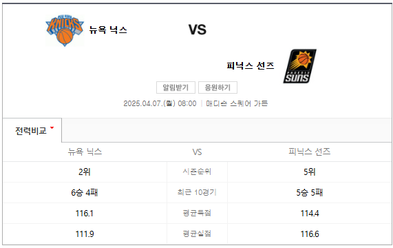 2025년 4월 7일, 뉴욕 닉스와 피닉스 선즈의 경기가 뉴욕의 매디슨 스퀘어 가든에서 열립니다. 이 경기는 NBA 정규 시즌의 중요한 일환으로, 두 팀 모두 플레이오프 진출을 위해 필사적인 싸움을 벌이고 있습니다. 매디슨 스퀘어 가든은 NBA 역사상 가장 상징적인 경기장 중 하나로, 팬들의 열기가 가득한 장소입니다.