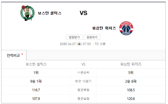 안녕하세요, 농구 팬 여러분! 오늘은 2025년 4월 7일에 열릴 보스턴 셀틱스와 워싱턴 위저즈의 경기에 대해 리뷰해 보겠습니다. 이 경기는 NBA 정규 시즌의 중요한 일환으로, 두 팀 모두 승리를 위해 최선을 다할 것입니다. 🏀