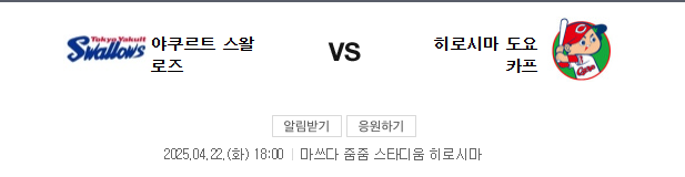이번 경기는 4월 22일 오후 6시에 시작됩니다. 야쿠르트 스왈로즈는 현재 리그에서 5위에 위치하고 있으며, 히로시마 도요카프는 4위에 자리 잡고 있습니다. 두 팀의 순위가 매우 근접해 있어, 이번 경기는 더욱 흥미진진할 것으로 보입니다.
