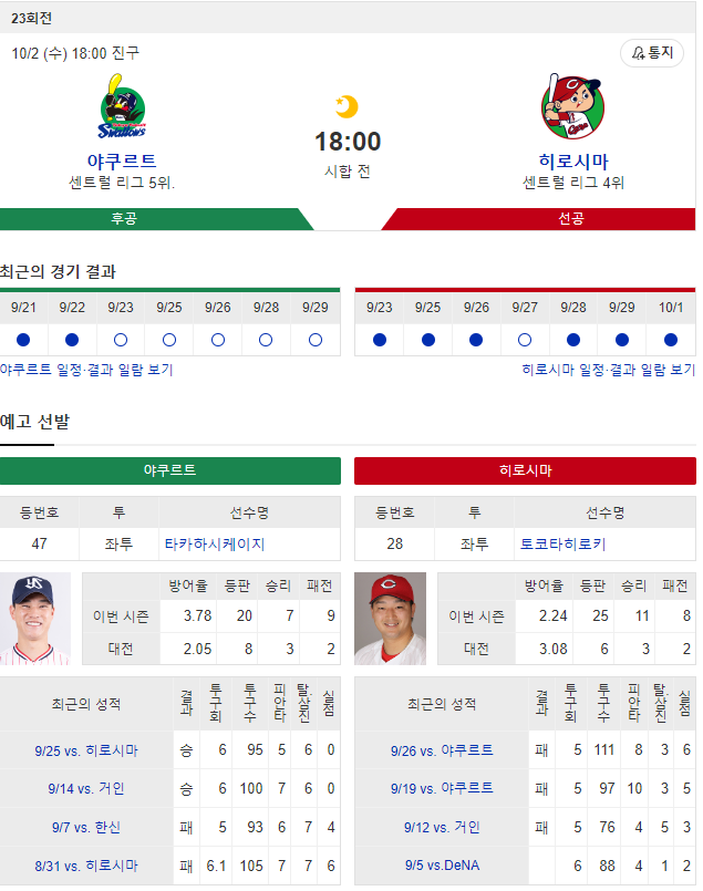 두 팀의 최근 경기 성적을 살펴보면, 야쿠르트는 최근 5경기에서 3승 2패를 기록하고 있으며, 히로시마는 4승 1패로 좋은 흐름을 이어가고 있습니다. 특히, 히로시마는 최근 경기에서 강력한 타선을 앞세워 많은 득점을 올리고 있습니다. 이러한 흐름은 이번 경기에서도 이어질 가능성이 높습니다.