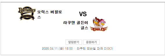 2025년 4월 11일, 오릭스 버팔로즈와 라쿠텐 골든이글스의 경기가 Kyocera Dome Osaka에서 열립니다. 이 경기는 일본 프로야구(NPB) 리그의 중요한 경기로, 두 팀 모두 승리를 위해 최선을 다할 것입니다.