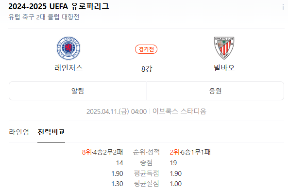 레인저스 FC와 아틀레틱 클럽의 경기가 2025년 04월 11일에 열립니다. 이 경기는 UEFA 유로파 리그의 중요한 대결로, 두 팀 모두 승리를 위해 최선을 다할 것입니다. 이번 포스트에서는 경기 분석과 예측을 통해 팬 여러분께 유익한 정보를 제공하고자 합니다. ⚽️