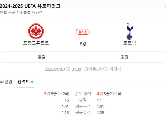 이번 경기는 두 팀 모두에게 중요한 경기입니다. 토트넘은 홈에서의 강력한 경기력을 바탕으로 승리를 노릴 것이며, 아인트라흐트 프랑크푸르트는 최근의 상승세를 이어가고자 할 것입니다. 예상되는 결과는 토트넘의 승리일 가능성이 높지만, 프랑크푸르트의 저항도 만만치 않을 것입니다. 따라서, 경기는 치열한 접전이 예상됩니다.